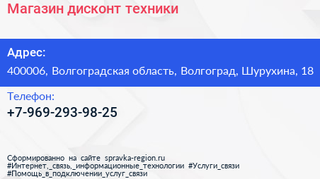 Магазин дисконт-техники по адресу 400006, Волгоградская область, Волгоград, Шурухина, 18 в дальнейшем Организация, размещена в следующих категориях: