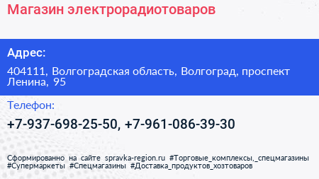 Магазин электрорадиотоваров по адресу 404111, Волгоградская область, Волгоград, проспект Ленина, 95 в дальнейшем Организация, размещена в следующих категориях: