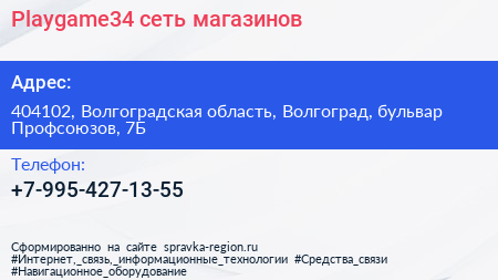 Playgame34, сеть магазинов по адресу 404102, Волгоградская область, Волгоград, бульвар Профсоюзов, 7Б в дальнейшем Организация, размещена в следующих категориях: