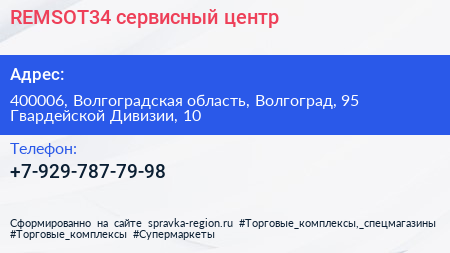 REMSOT34, сервисный центр по адресу 400006, Волгоградская область, Волгоград, 95 Гвардейской Дивизии, 10 в дальнейшем Организация, размещена в следующих категориях:
