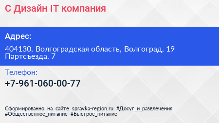 С-Дизайн, IT-компания по адресу 404130, Волгоградская область, Волгоград, 19 Партсъезда, 7 в дальнейшем Организация, размещена в следующих категориях: