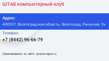ШТАБ, компьютерный клуб по адресу 400107, Волгоградская область, Волгоград, Рионская, 9а в дальнейшем Организация, размещена в следующих категориях: