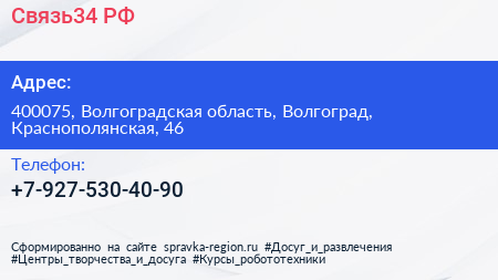Связь34.РФ по адресу 400075, Волгоградская область, Волгоград, Краснополянская, 46 в дальнейшем Организация, размещена в следующих категориях: