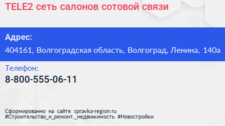 TELE2, сеть салонов сотовой связи по адресу 404161, Волгоградская область, Волгоград, Ленина, 140а в дальнейшем Организация, размещена в следующих категориях: