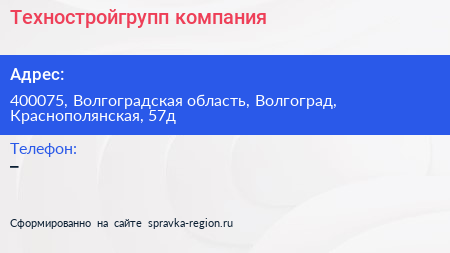Техностройгрупп, компания по адресу 400075, Волгоградская область, Волгоград, Краснополянская, 57д в дальнейшем Организация, размещена в следующих категориях: