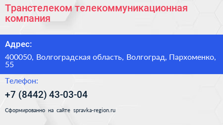 Транстелеком, телекоммуникационная компания по адресу 400050, Волгоградская область, Волгоград, Пархоменко, 55 в дальнейшем Организация, размещена в следующих категориях: