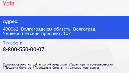 Yota по адресу 400062, Волгоградская область, Волгоград, Университетский проспект, 107 в дальнейшем Организация, размещена в следующих категориях: