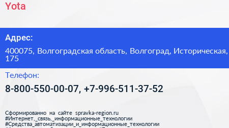 Yota по адресу 400075, Волгоградская область, Волгоград, Историческая, 175 в дальнейшем Организация, размещена в следующих категориях: