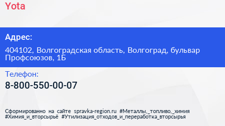 Yota по адресу 404102, Волгоградская область, Волгоград, бульвар Профсоюзов, 1Б в дальнейшем Организация, размещена в следующих категориях: