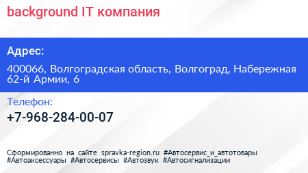 background., IT-компания по адресу 400066, Волгоградская область, Волгоград, Набережная 62-й Армии, 6 в дальнейшем Организация, размещена в следующих категориях: