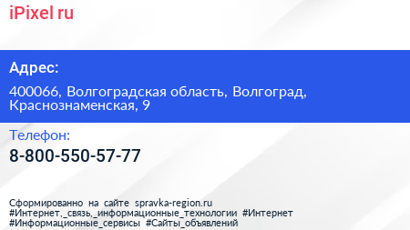 iPixel.ru по адресу 400066, Волгоградская область, Волгоград, Краснознаменская, 9 в дальнейшем Организация, размещена в следующих категориях: