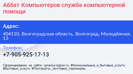Аббат Компьютеров, служба компьютерной помощи по адресу 404110, Волгоградская область, Волгоград, Молодёжная, 13 в дальнейшем Организация, размещена в следующих категориях: