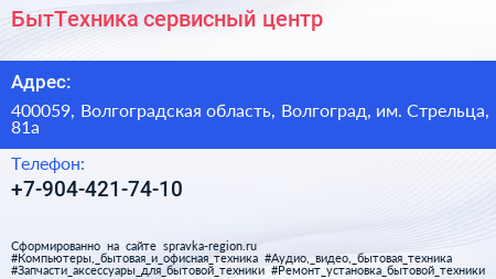 БытТехника, сервисный центр по адресу 400059, Волгоградская область, Волгоград, им. Стрельца, 81а в дальнейшем Организация, размещена в следующих категориях: