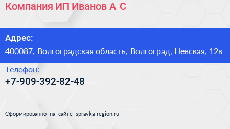 Компания, ИП Иванов А.С. по адресу 400087, Волгоградская область, Волгоград, Невская, 12в в дальнейшем Организация, размещена в следующих категориях: