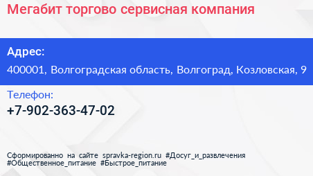 Мегабит, торгово-сервисная компания по адресу 400001, Волгоградская область, Волгоград, Козловская, 9 в дальнейшем Организация, размещена в следующих категориях: