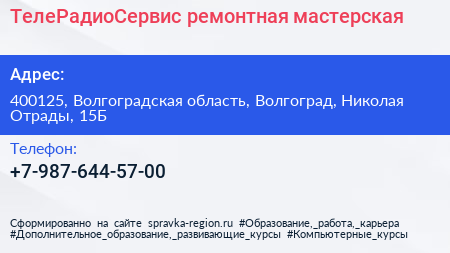 ТелеРадиоСервис, ремонтная мастерская по адресу 400125, Волгоградская область, Волгоград, Николая Отрады, 15Б в дальнейшем Организация, размещена в следующих категориях: