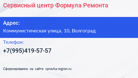Сервисный центр "Формула Ремонта" по адресу Коммунистическая улица, 10, Волгоград в дальнейшем Организация, размещена в следующих категориях: