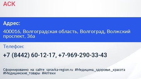 АСК по адресу 400016, Волгоградская область, Волгоград, Волжский проспект, 36а в дальнейшем Организация, размещена в следующих категориях: