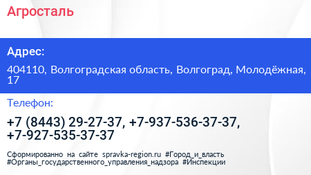 Агросталь по адресу 404110, Волгоградская область, Волгоград, Молодёжная, 17 в дальнейшем Организация, размещена в следующих категориях: