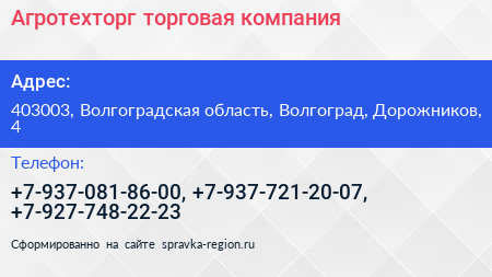 Агротехторг, торговая компания по адресу 403003, Волгоградская область, Волгоград, Дорожников, 4 в дальнейшем Организация, размещена в следующих категориях: