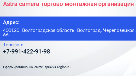 Astra camera, торгово-монтажная организация по адресу 400120, Волгоградская область, Волгоград, Череповецкая, 66 в дальнейшем Организация, размещена в следующих категориях: