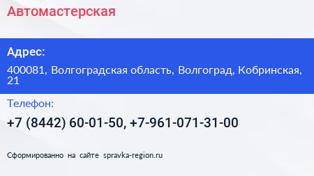 Автомастерская по адресу 400081, Волгоградская область, Волгоград, Кобринская, 21 в дальнейшем Организация, размещена в следующих категориях: