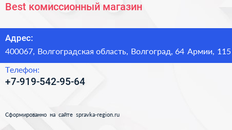 Best, комиссионный магазин по адресу 400067, Волгоградская область, Волгоград, 64 Армии, 115 в дальнейшем Организация, размещена в следующих категориях: