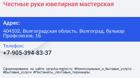 Честные руки, ювелирная мастерская по адресу 404102, Волгоградская область, Волгоград, бульвар Профсоюзов, 1Б в дальнейшем Организация, размещена в следующих категориях:
