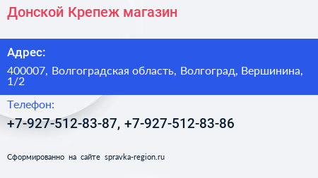Донской Крепеж, магазин по адресу 400007, Волгоградская область, Волгоград, Вершинина, 1/2 в дальнейшем Организация, размещена в следующих категориях:
