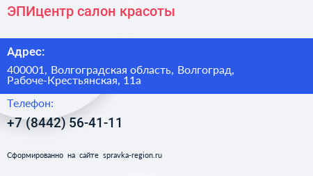 ЭПИцентр, салон красоты по адресу 400001, Волгоградская область, Волгоград, Рабоче-Крестьянская, 11а в дальнейшем Организация, размещена в следующих категориях: