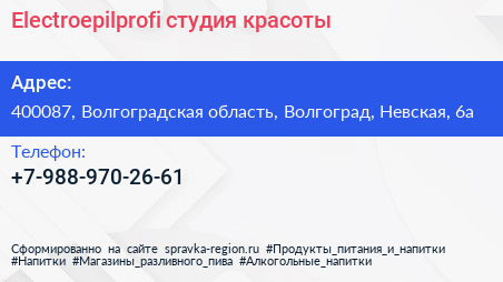 Electroepilprofi, студия красоты по адресу 400087, Волгоградская область, Волгоград, Невская, 6а в дальнейшем Организация, размещена в следующих категориях:
