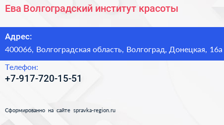 Ева, Волгоградский институт красоты по адресу 400066, Волгоградская область, Волгоград, Донецкая, 16а в дальнейшем Организация, размещена в следующих категориях: