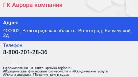 ГК Аврора, компания по адресу 400002, Волгоградская область, Волгоград, Качуевской, 2д в дальнейшем Организация, размещена в следующих категориях: