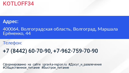 KOTLOFF34 по адресу 400064, Волгоградская область, Волгоград, Маршала Ерёменко, 44 в дальнейшем Организация, размещена в следующих категориях: