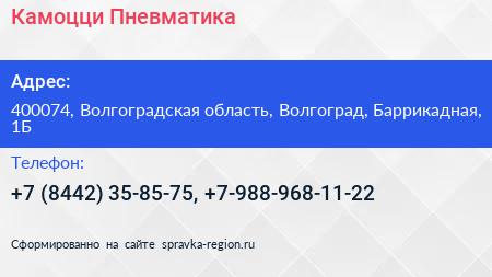Камоцци Пневматика по адресу 400074, Волгоградская область, Волгоград, Баррикадная, 1Б в дальнейшем Организация, размещена в следующих категориях:
