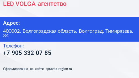 LED-VOLGA, агентство по адресу 400002, Волгоградская область, Волгоград, Тимирязева, 34 в дальнейшем Организация, размещена в следующих категориях: