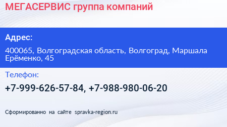 МЕГАСЕРВИС, группа компаний по адресу 400065, Волгоградская область, Волгоград, Маршала Ерёменко, 45 в дальнейшем Организация, размещена в следующих категориях: