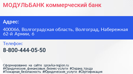 МОДУЛЬБАНК, коммерческий банк по адресу 400066, Волгоградская область, Волгоград, Набережная 62-й Армии, 6 в дальнейшем Организация, размещена в следующих категориях:
