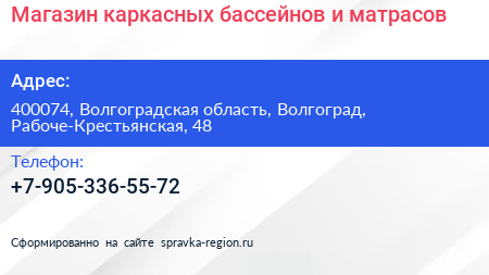 Магазин каркасных бассейнов и матрасов по адресу 400074, Волгоградская область, Волгоград, Рабоче-Крестьянская, 48 в дальнейшем Организация, размещена в следующих категориях: