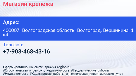 Магазин крепежа по адресу 400007, Волгоградская область, Волгоград, Вершинина, 1 к4 в дальнейшем Организация, размещена в следующих категориях: