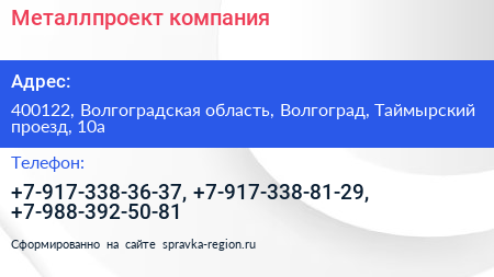 Металлпроект, компания по адресу 400122, Волгоградская область, Волгоград, Таймырский проезд, 10а в дальнейшем Организация, размещена в следующих категориях: