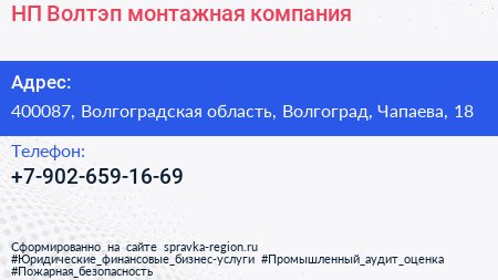НП Волтэп, монтажная компания по адресу 400087, Волгоградская область, Волгоград, Чапаева, 18 в дальнейшем Организация, размещена в следующих категориях: