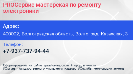 PROСервис, мастерская по ремонту электроники по адресу 400002, Волгоградская область, Волгоград, Казахская, 3 в дальнейшем Организация, размещена в следующих категориях: