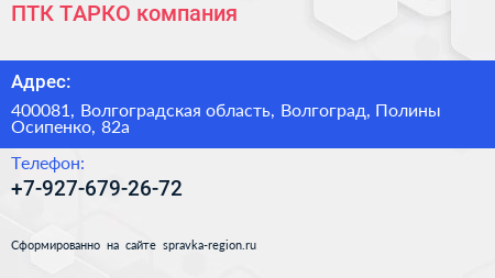 ПТК ТАРКО, компания по адресу 400081, Волгоградская область, Волгоград, Полины Осипенко, 82а в дальнейшем Организация, размещена в следующих категориях: