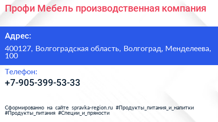 Профи Мебель, производственная компания по адресу 400127, Волгоградская область, Волгоград, Менделеева, 100 в дальнейшем Организация, размещена в следующих категориях: