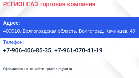 РЕГИОНГАЗ, торговая компания по адресу 400010, Волгоградская область, Волгоград, Качинцев, 49 в дальнейшем Организация, размещена в следующих категориях:
