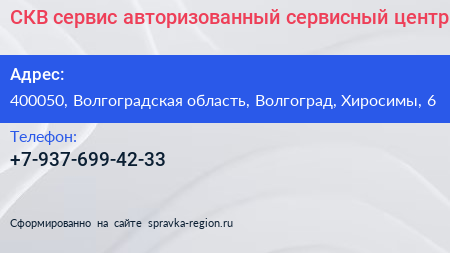 СКВ сервис, авторизованный сервисный центр по адресу 400050, Волгоградская область, Волгоград, Хиросимы, 6 в дальнейшем Организация, размещена в следующих категориях: