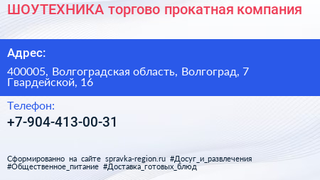 ШОУТЕХНИКА, торгово-прокатная компания по адресу 400005, Волгоградская область, Волгоград, 7 Гвардейской, 16 в дальнейшем Организация, размещена в следующих категориях:
