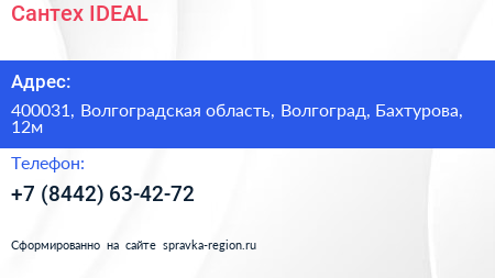 Сантех IDEAL по адресу 400031, Волгоградская область, Волгоград, Бахтурова, 12м в дальнейшем Организация, размещена в следующих категориях: