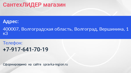 СантехЛИДЕР, магазин по адресу 400007, Волгоградская область, Волгоград, Вершинина, 1 к3 в дальнейшем Организация, размещена в следующих категориях: